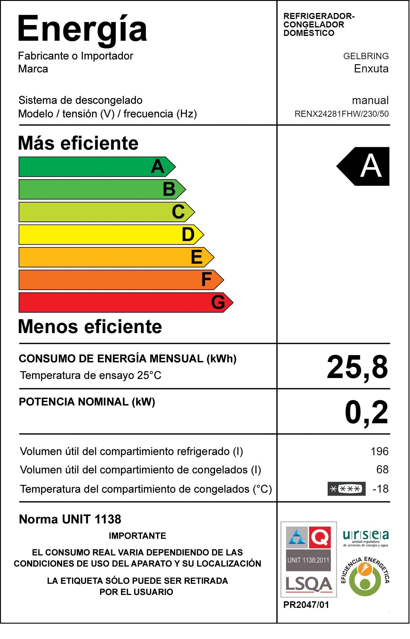 Capacidad de refrigerador: 196 Lts.